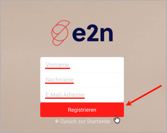 - Als nächstes gibst Du Deinen Vor- und Nachnamen und Deine E-Mail-Adresse ein und klickst auf Registrieren: