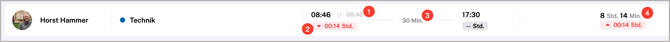 → Du siehst außerdem die Abweichung der Arbeitszeit von der geplanten Schicht des Dienstplans (die Legende für die Pünktlichkeitsprüfung findest Du hier.) - Dauer der erfassten Pause: