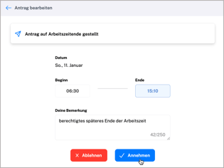 → klicke auf die Uhrzeit mit dem Papierfliegersymbol, um den Antrag zu bearbeiten: