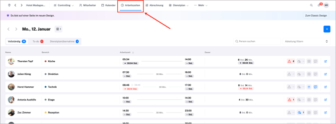 Du erreichst die Arbeitszeitenübersicht über den Punkt Arbeitszeiten oben in Deiner Navigationsleiste: