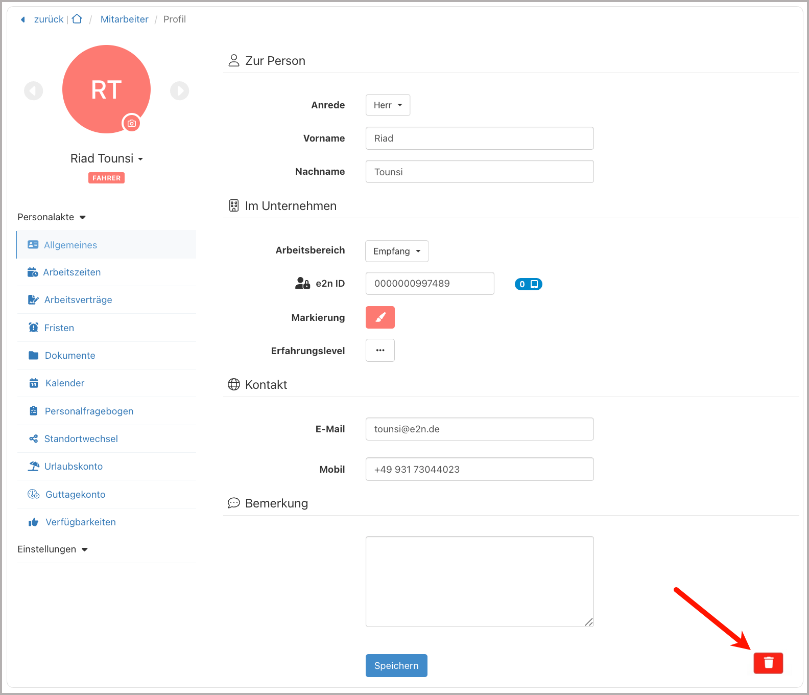 Solltest Du anstelle des Papierkorbs den Button gelben Button Abmelden sehen, kann die Personalakte nicht gelöscht werden.