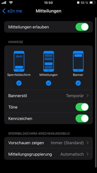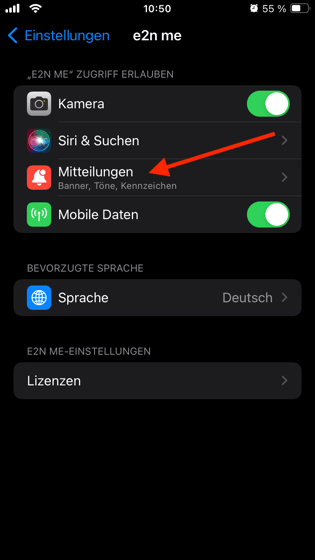 Einstellungen > Apps > e2n App > Benachrichtigungen