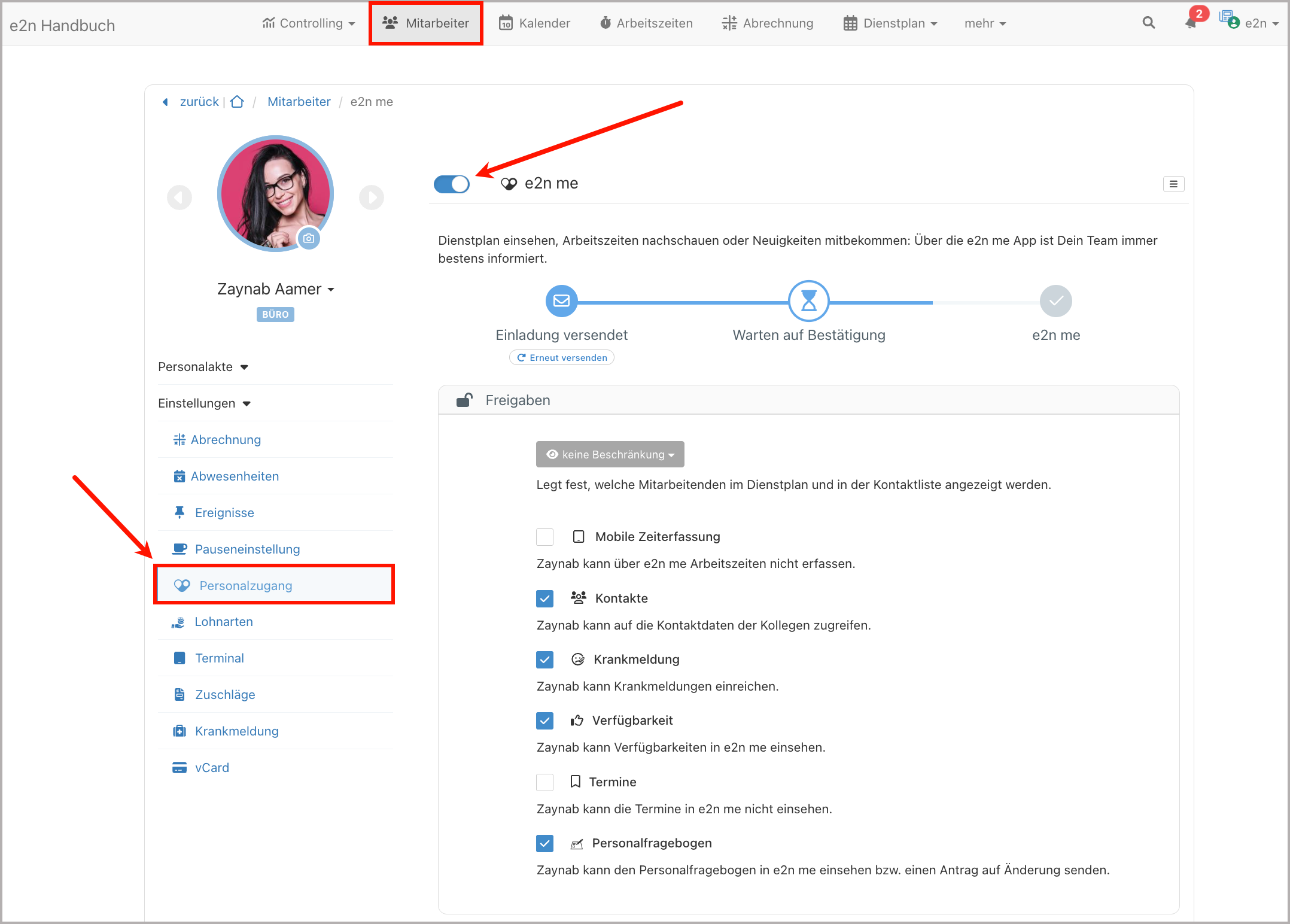 Aktiviere den Personalzugang für Deine Mitarbeitenden in den einzelnen Personalakten über den entsprechenden Schieberegler: