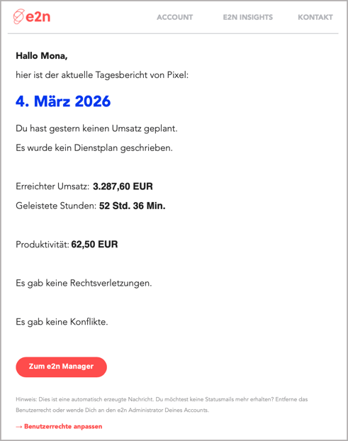 Ist für Deinen Manager*innen-Zugang das Recht "Statusmail" aktiviert, erhältst Du täglich eine E-Mail mit den wichtigsten Informationen und Zahlen Deines Standorts.