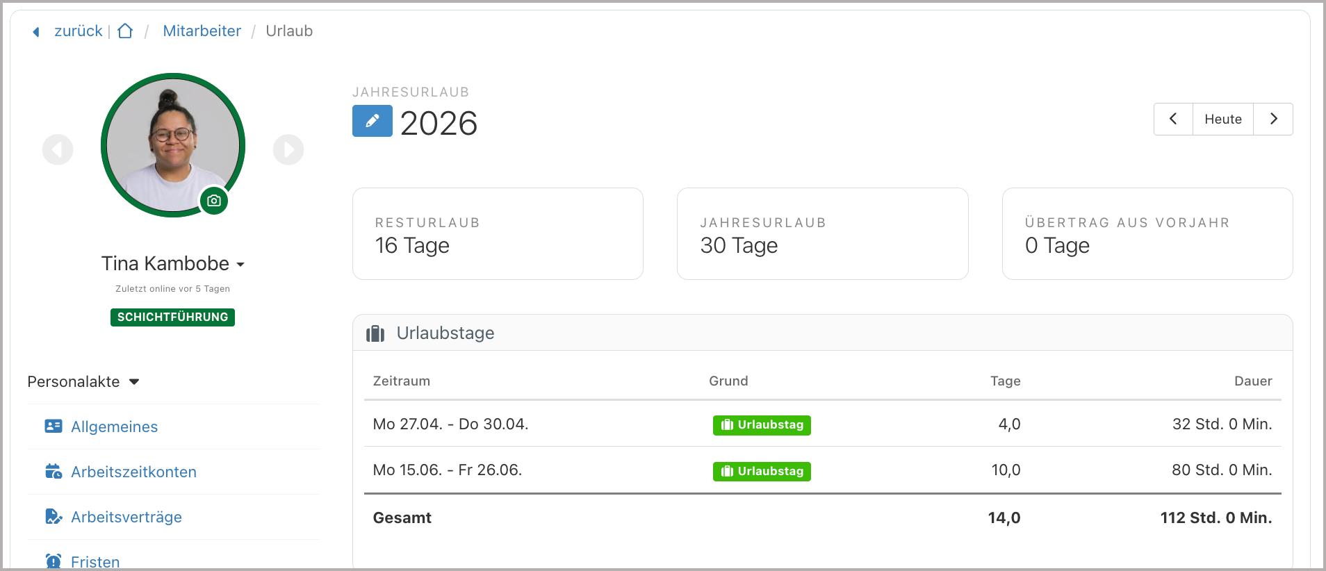 Im Urlaubskonto der Mitarbeiterin siehst Du auf einen Blick, wie viel Resturlaub sie hat, welcher Jahresurlaubsanspruch im aktuellen Jahr besteht und ob es einen Übertrag aus dem Vorjahr gab.